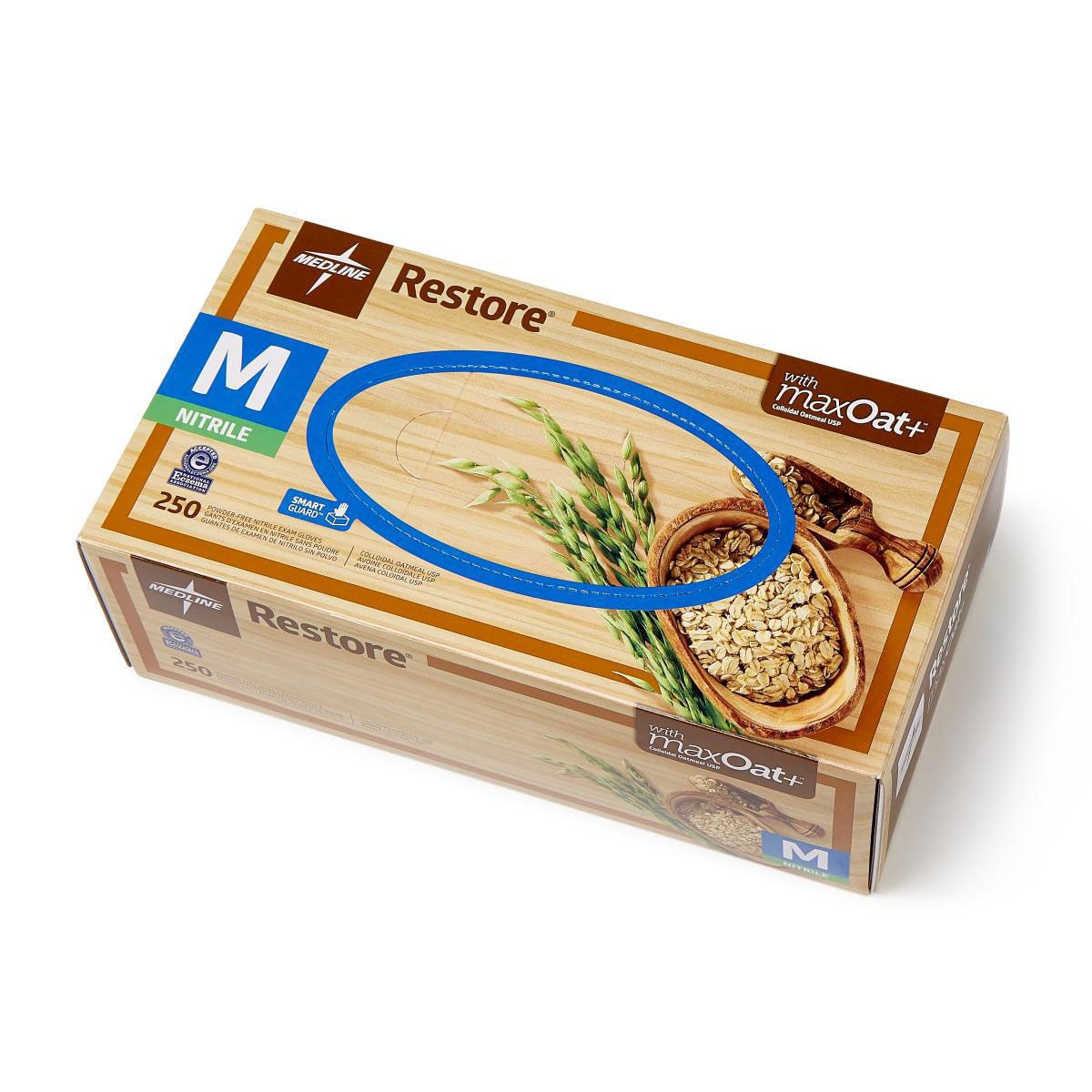 Medline Restore Nitrile Exam Gloves put a layer of maxOat+ colloidal oatmeal between your skin and glove to help relieve conditions associated with dry skin. The result: hands feel softer, smoother and ready to perform.
