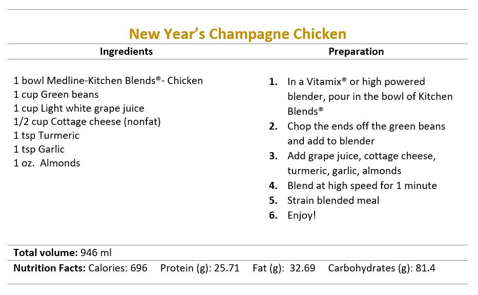 Kitchen Blends recipes: New Year's champagne chicken Dec 30, 2019 blenderized food blenderized diet kitchen blends Related Posts Kitchen Blends Recipes: Hanukkah Dinner Kitchen Blends recipes: Christmas cranberry chicken dinner Kitchen Blends recipes: Chinese New Year noodles