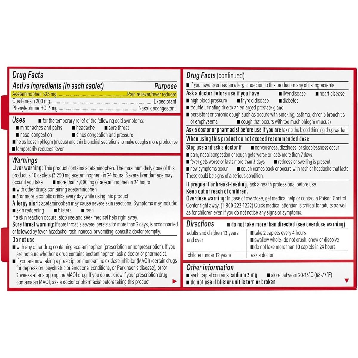 • 325 mg acetaminophen, 200 mg guaifenesin, 5 mg phenylephrine