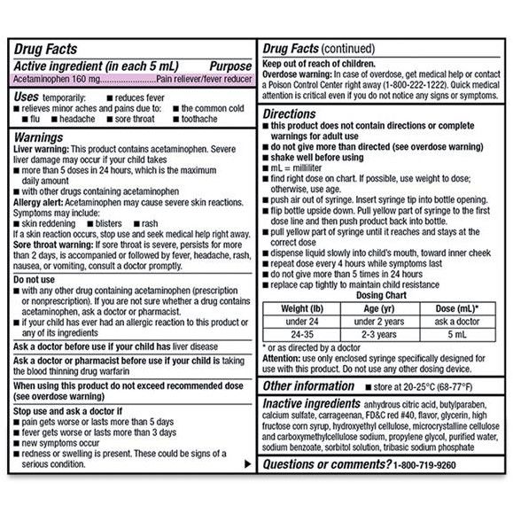 • Active ingredient per 5 mL does: 160 mg acetaminophen