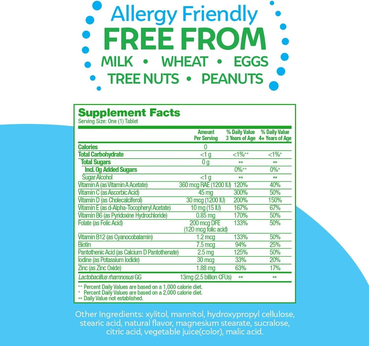 - Dietary supplement for kids age 3 and up contains 11 essential vitamins and minerals plus a probiotic (Lactobacillus rhamnosus GG)